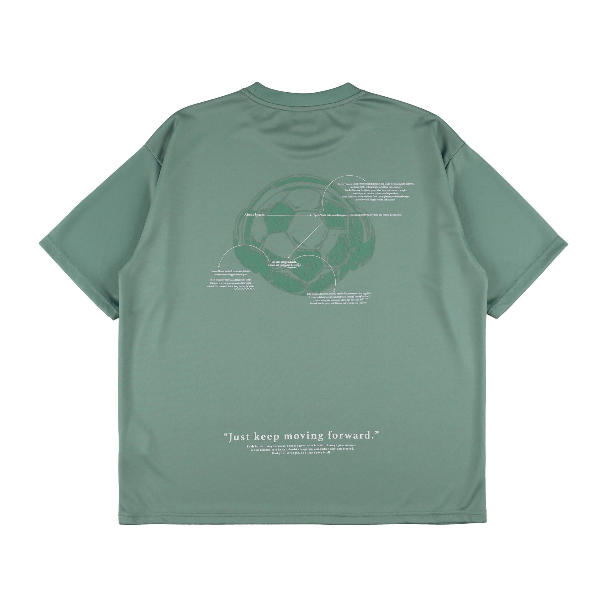 背面に大きなサッカーボールとヘッドフォンのグラフィックを配置した大胆なデザイン。フロントはシンプルなロゴでまとめ、バックスタイルに視線を集める一枚。オーバーサイズのゆったり感とスポーティーなモチーフがマッチ。